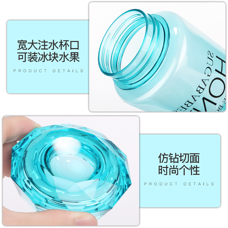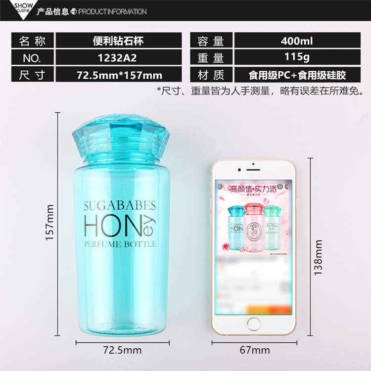 產品特點:容量400ML,食品級PC+食用級硅膠,寬大注水杯口,可裝冰塊水果,絲印工藝不易掉漆